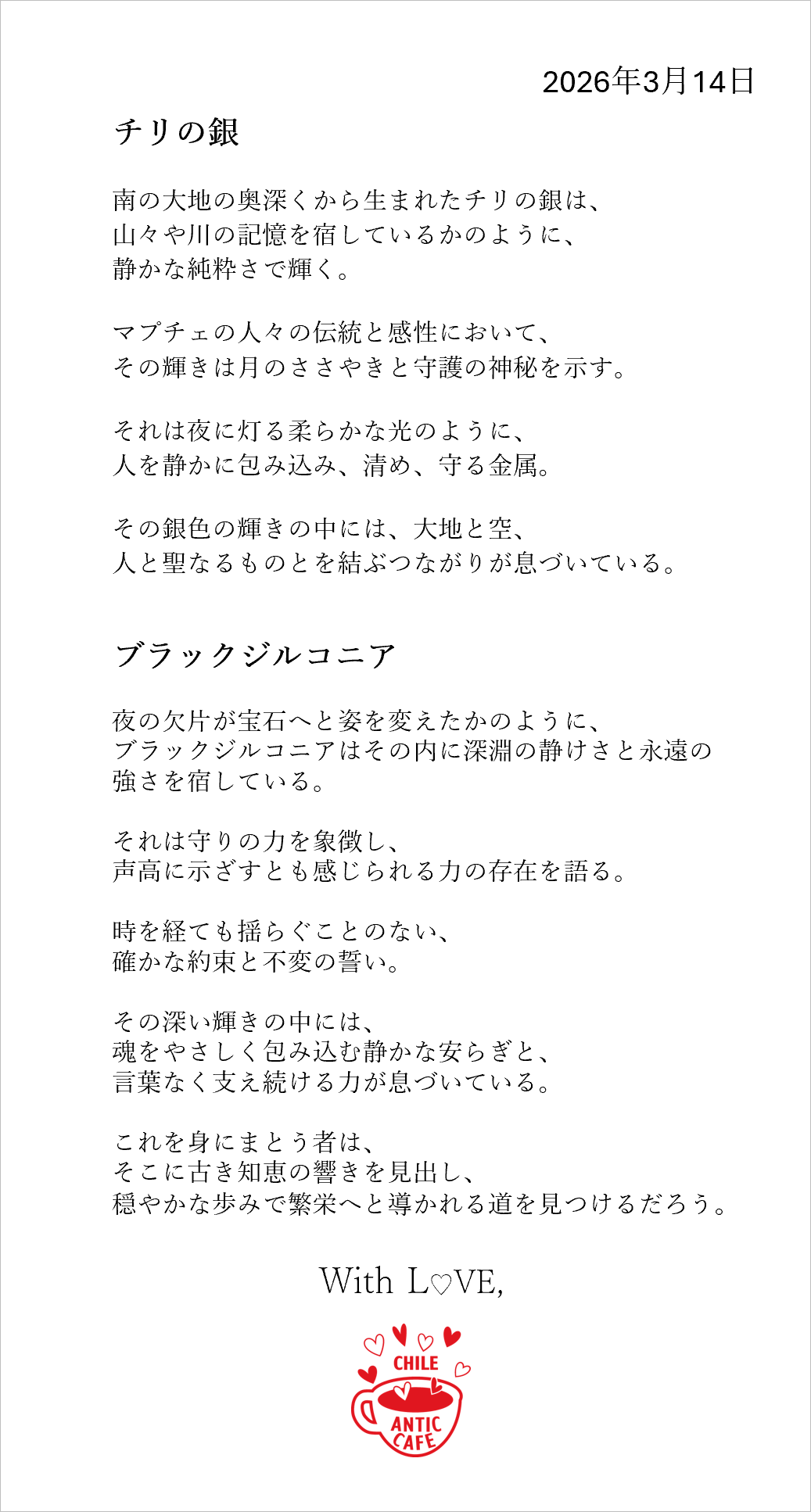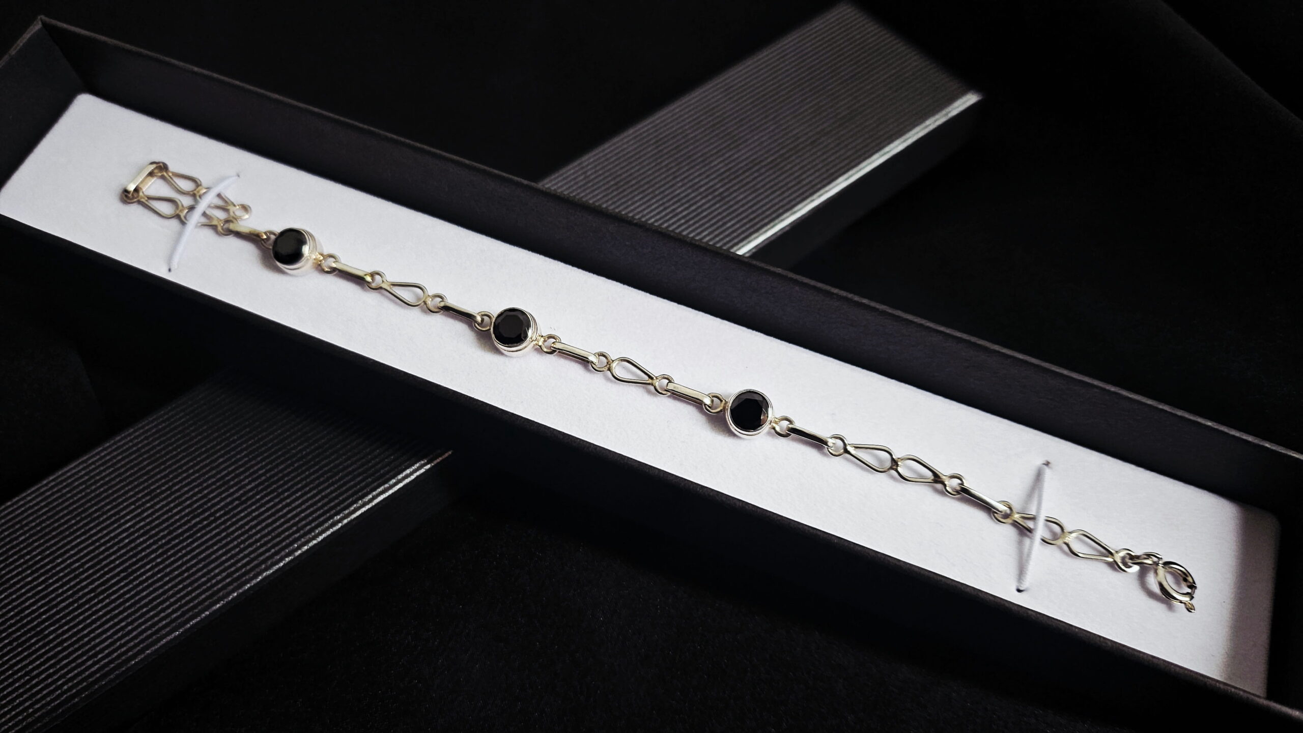 Es una pulsera de plata chilena con circonia negra, la cual tiene su significado traducido al japonés. La plata, profundamente ligada a la naturaleza y a las tradiciones artesanales de nuestro país, simboliza protección y conexión. La circonia negra, por su parte, representa fuerza, constancia y apoyo.