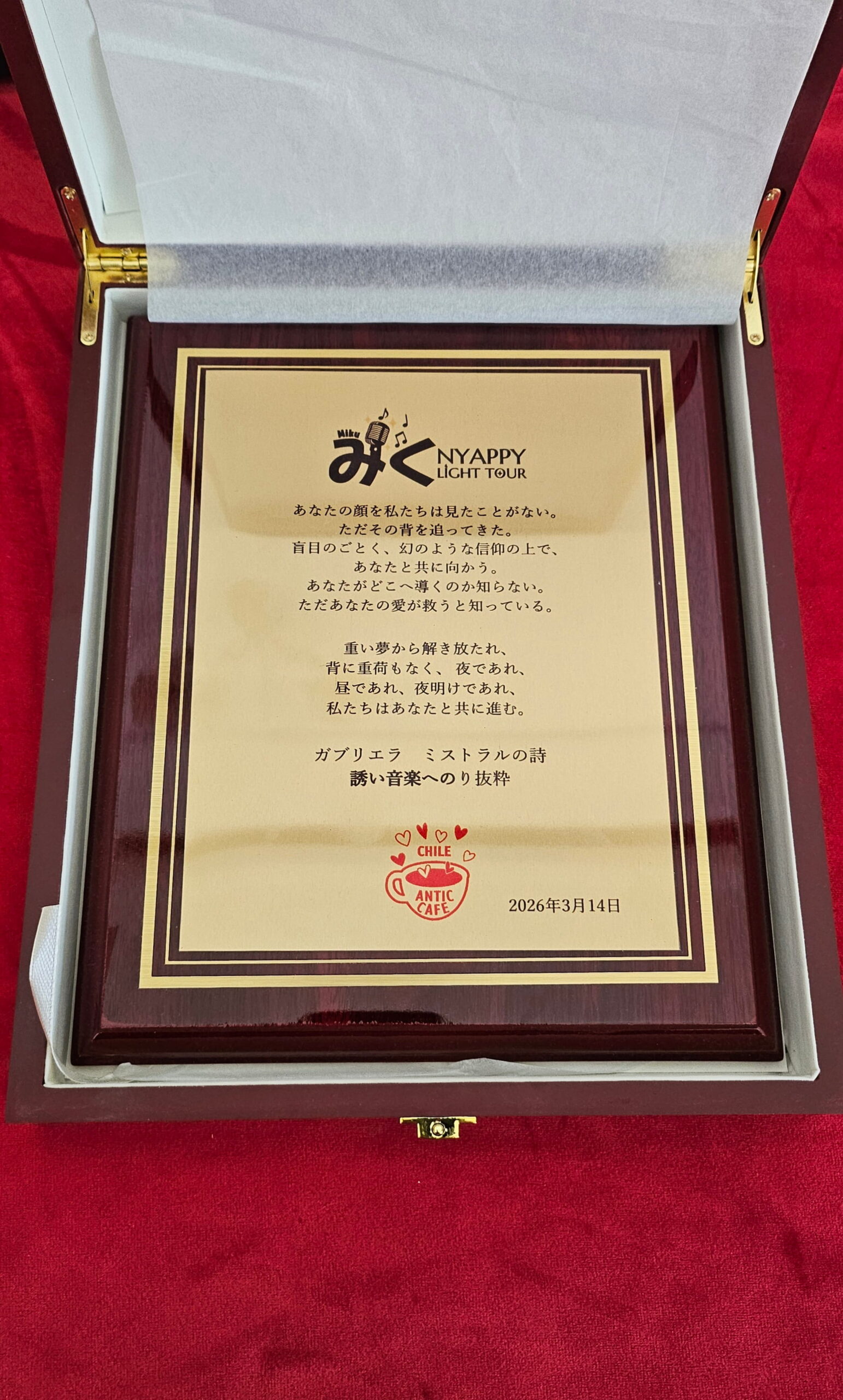 Asimismo, un galvano simbólico que contiene algunos versos del poema “Invitación a la música” de Gabriela Mistral, junto con la traducción al japonés del poema completo.